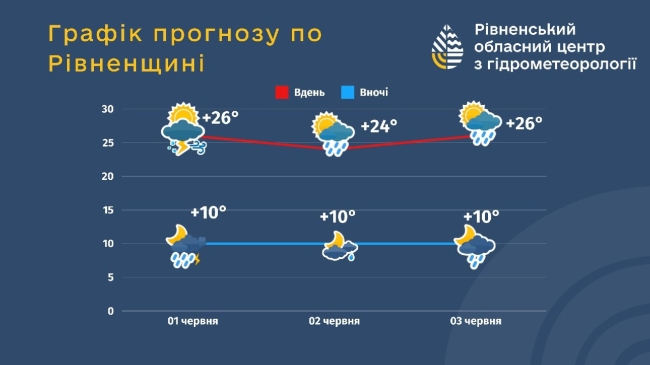 1 червня, субота: мінлива хмарність. Короткочасний дощ, гроза, вдень місцями град. Вночі та вранці слабкий туман. Вітер південний, 7-12 м/с, під час грози місцями шквали 15-20м/с
