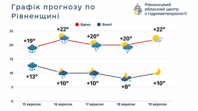 16-19 вересня погоду визначатимуть атмосферні фронти. Пройдуть короткочасні дощі різної інтенсивності. Температурний фон в денні години коливатиметься в межах +15..+20º і лише 19 вересня очікується суха погода та підвищення денної температури до +22º, – прогнозують фахівці обласного центру з гідрометеорології.