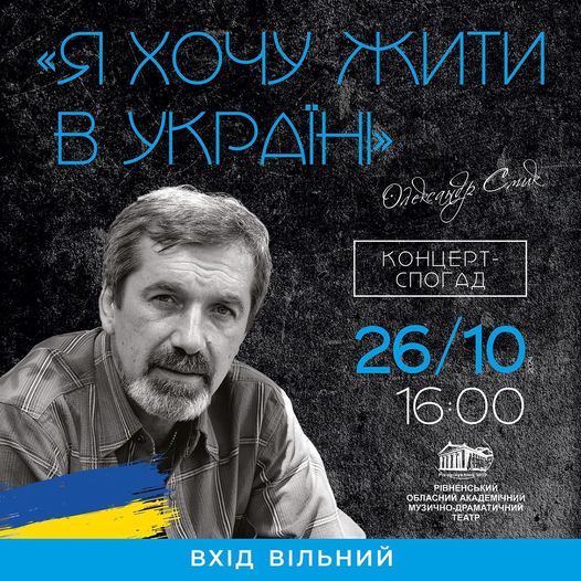26 жовтня у Рівненському академічному музично-драматичному театрі о 16:00 відбудеться концерт-спогад "Я хочу жити в Україні" - данина пам’яті чудовому поету, барду, драматургу Олександру Смику, який тривалий час жив і працював у Рівному.