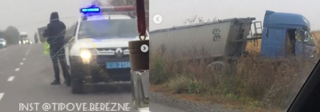 Після зіткнення, яке сталось біля повороту з траси Рівне-Городище-Старокостянтинів на Березне, одна з вантажівок злетіла в кювет. За попередною інформацією, причиною цієї ДТП стало не дотримання безпечної дистанції руху, через що одна вантажівка підбила іншу. Усі обставини цієї ДТП зараз встановлюють поліцейські. Фото та відео очевидці оприлюднили в інстаграм-спільноті tipove.berezne.