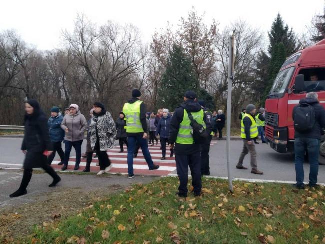 Протестувальники рухаються пішохідним переходом, аби привернути увагу чиновників до їхньої проблеми. На місці протесту працюють правоохоронці.