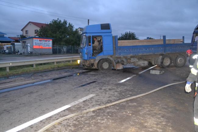 Зіткнувшись з відбійником,  два вантажних автомобіля перекрили проїжджу частину автодороги траси Київ-Чоп. На дорогу вилилася значна кількість паливно-мастильних матеріалів. Будь-якої миті легкозаймиста рідина могла спалахнути. Щоб запобігти біді, рятувальники водяним стволом змили паливно-мастильні матеріали з дороги та з місця ДТП. А потім відбуксирували з проїжджої частини вантажні автомобілі. Жертв та постраждалих не має.Усі обставини ДТП з’ясовують правоохоронці.
