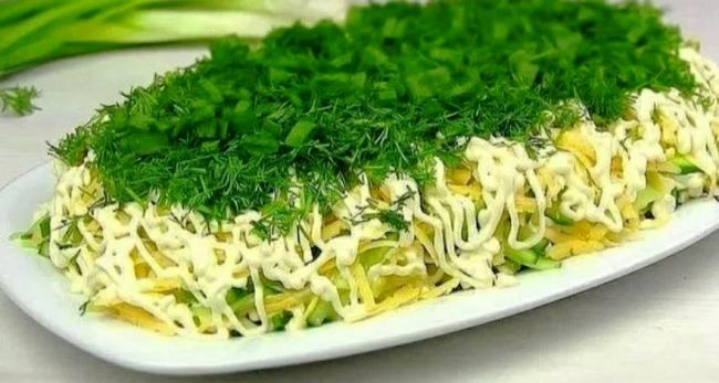 Філе 1 оселедця, 1 свіжий огірок, 150 г твердого сиру, 2 варених картоплини, по пучку кропу і зеленої цибулі, майонез