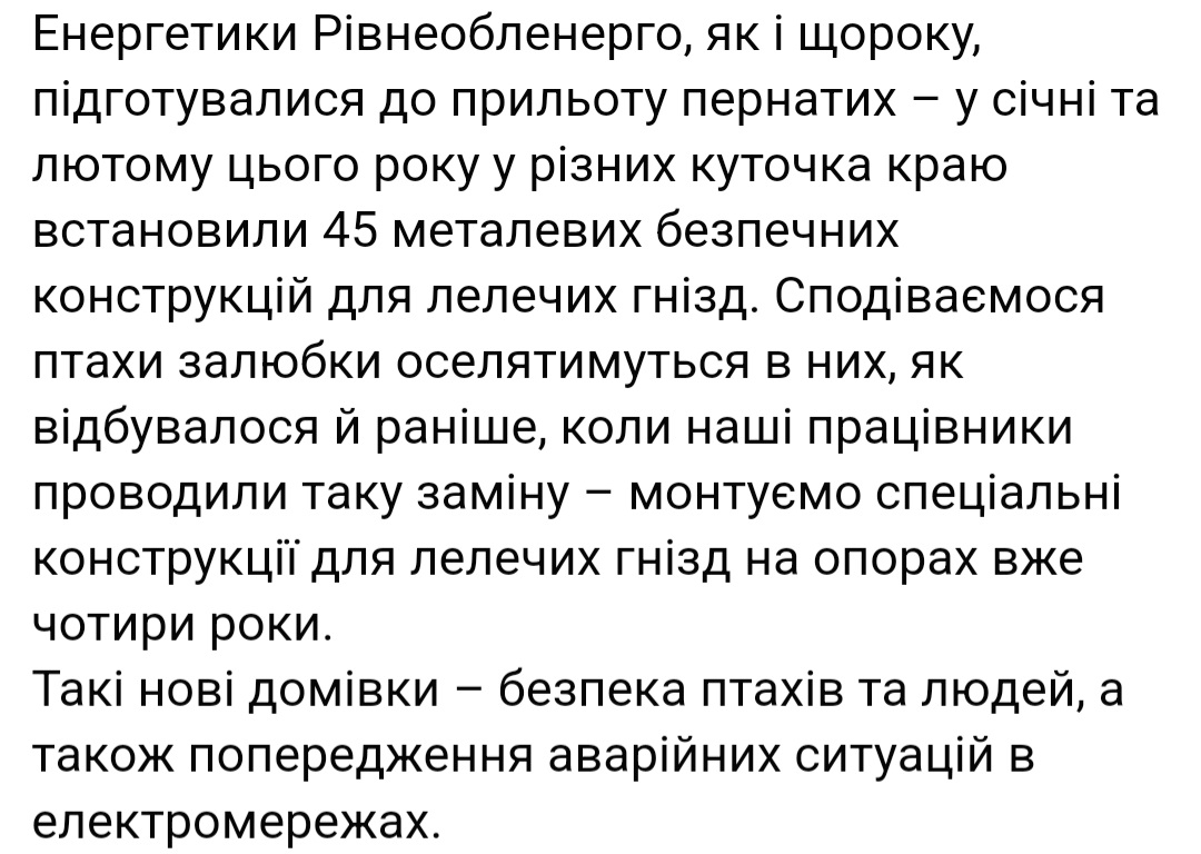 20 березня – день весняного рівнодення. В народі вважається, що саме після його настання птахи повертаються з далеких країв додому, в Україну. А щоб пернатим було комфортніше, працівники Рівнеобленерго підготували для них спеціальні конструкції на електроопорах.
