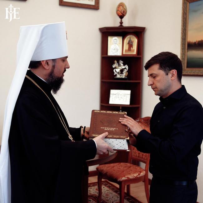 Предстоятель ПЦУ подарував новообраному президенту репринтне видання Острозької Біблії – першого повного друкованого тексту Старого і Нового Заповітів слов’янською мовою, надрукованого наприкінці XVI століття.