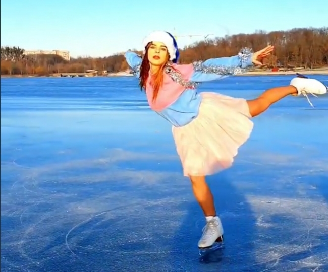 Дівчина, окрім ковзанів одягнула новорічну шапку “Снігурки”. Образ підкреслив її зовсім не аматорське вміння кататися на ковзанах.