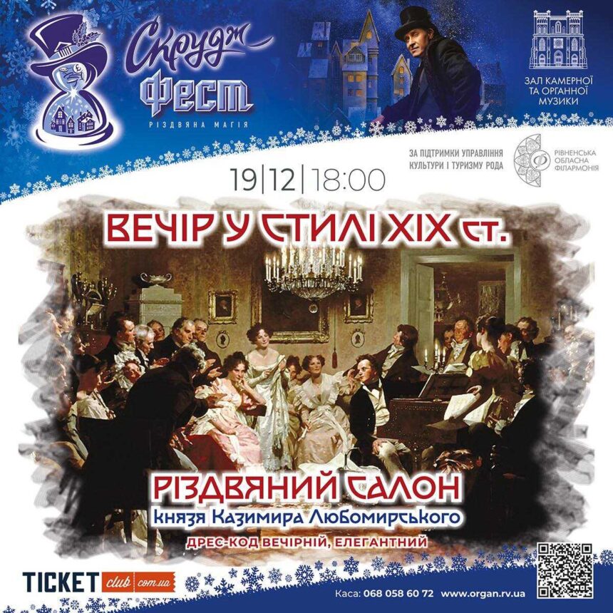 Подія проходить у межах ІІ Міжнародного фестивалю «Скрудж-фест», що нині триває у Рівному. Гостей зустрічатиме струнний квартет, а солісти Рівненської обласної філармонії виконають твори європейського репертуару ХІХ століття — від витонченої салонної лірики до популярних різдвяних композицій, які звучали у шляхетних домах.