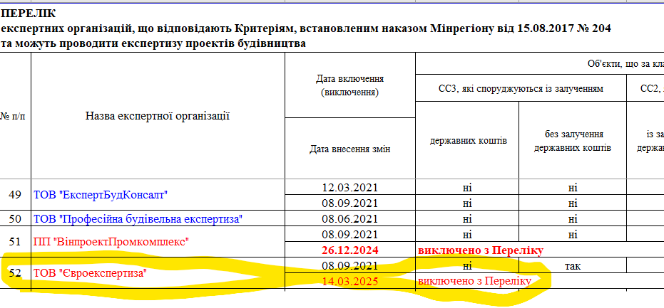 Робоча група відділу економіки та організації будівництва Департаменту ціноутворення, економіки та організації будівництва Міністерства розвитку громад та територій України 14 березня виключила ТОВ «Євроекспертиза» із Переліку експертних організацій, що відповідають критеріям, встановленим наказом Мінрегіону №204 від 15.08.2017, і можуть проводити експертизу проектів будівництва.