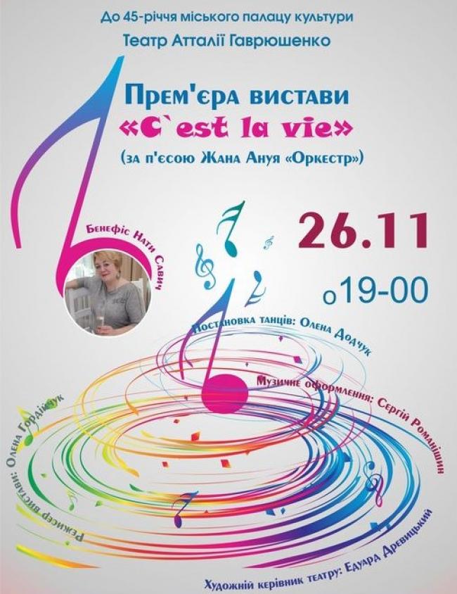 «C`est la vie» – вистава, яка відбудеться у міському палаці культури – реалістична, з неприкрашеною картиною людських відносин. Тут любов і інтриги, пристрасті і розчарування. “Трішечки одружені» і закохані до безтями. Тут шматки спаплюженого кохання і великі сподівання. Егоїзм і дрібне життя. Зваба і любов.