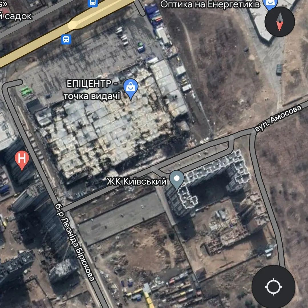 Також на знімках супутника бачимо дах вщент зруйнованого «Епіцентру», хоча нині всі конструкції тут повністю демонтовані й активно ведеться будівництво нової будівлі торгівельного центру.