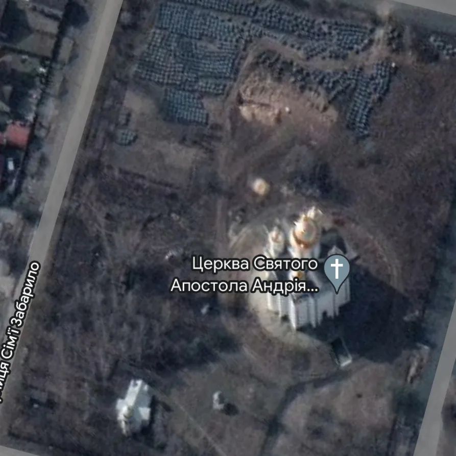 На них, зокрема, бачимо братську могилу на території Храму Святого Апостола Андрія Первозванного. Тіла мирних бучанців, вбитих окупантами, з неї вже ексгумували. Проте пам’ятного знаку, який нині встановлений на місці трагедії, на супутникових фото Google ще немає.