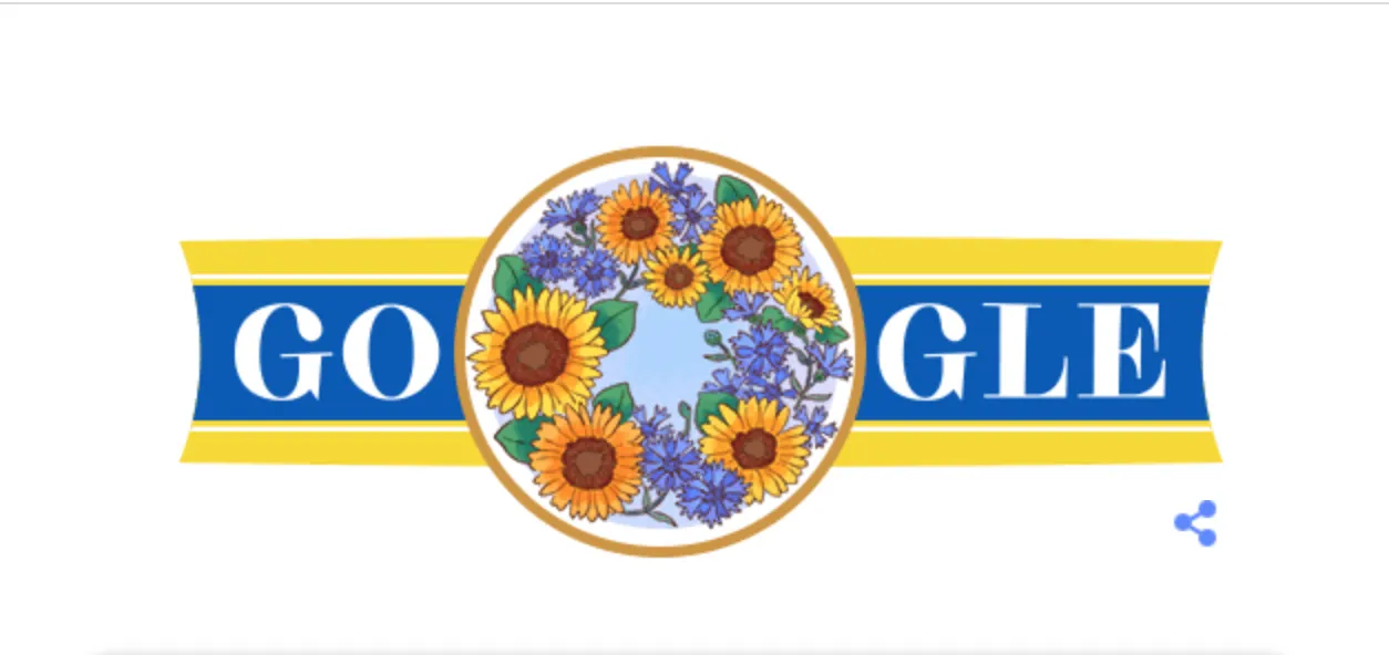 На логотипі зображено соняшники і волошки – національні квіти-символи України. Дудл виконаний у синьому і жовтому відтінках – кольорах прапора України.
