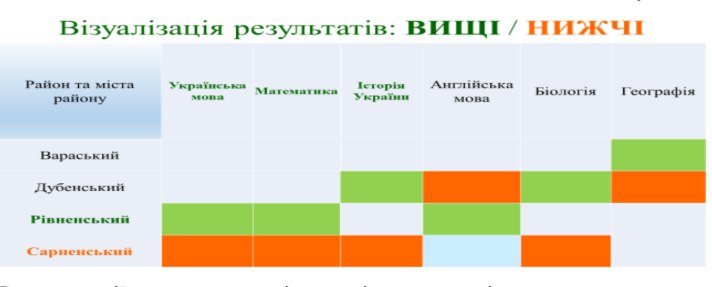 Відтак, підрахунки показали, що найкращими стали результати учасників НМТ 2023 – 2025 років у Рівненському районі (українська мова, математика, англійська мова), а найнижчі — в Сарненському (українська мова, математика, історія України, біологія).