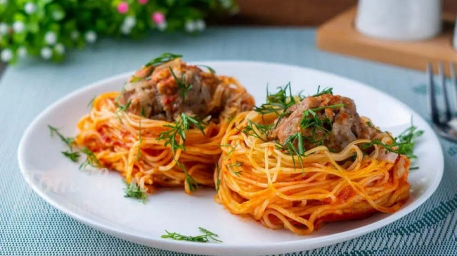 Макаронні гнізда з фаршем на сковороді — це ситна й смачна вечеря з ефектним виглядом. Дітям точно сподобається! Для приготування знадобиться трохи фаршу, томатна паста та, звісно, макарони у формі гнізд.