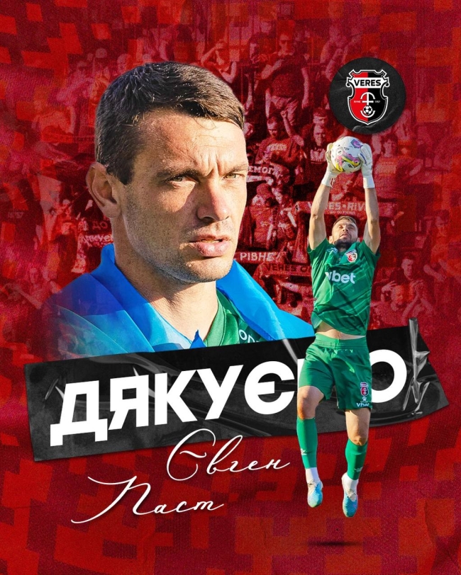 Народний клуб Верес подякував Євгену Пасту за співпрацю, побажав голкіперу якомога швидшого відновлення і нових перемог на футбольному полі
