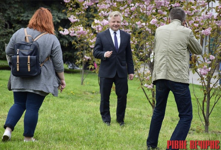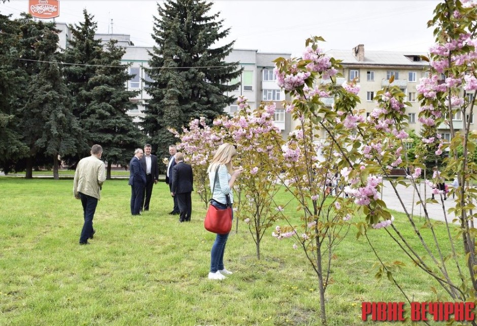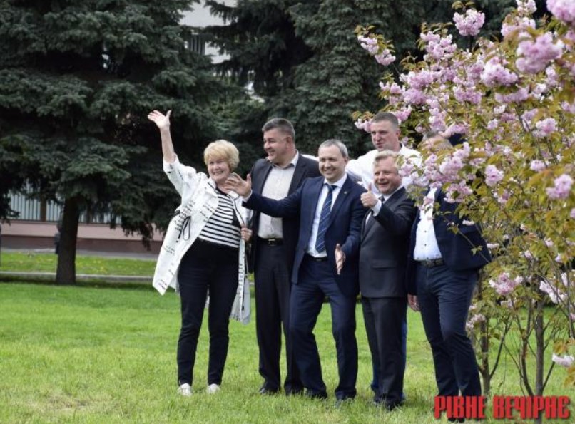 В обідню пору голова Рівненської ОДА, а заодно депутат міськради Олексій Муляренко разом зі своїми міськими колегами влаштував фотосесію навпроти кінопалацу «Україна», де якраз квітнуть сакури.