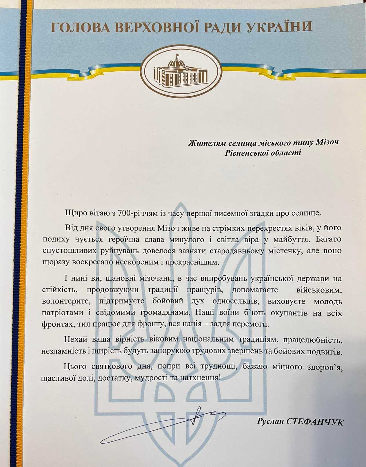 Голова Верховної Ради України Руслан Стефанчук надіслав привітання жителям Мізоцької громади з нагоди 700-річчя із часу першої писемної згадки.