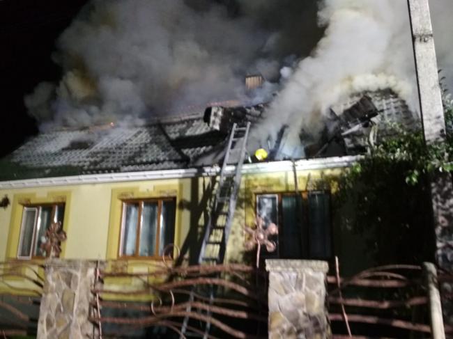 Одна група рятувальників оперативно подала на гасіння пожежі вогнегасячі речовини в осередок займання, що стався на покрівлі будинку, в той час друга група вогнеборців рятували матеріальні цінності з першого поверху будинку.
