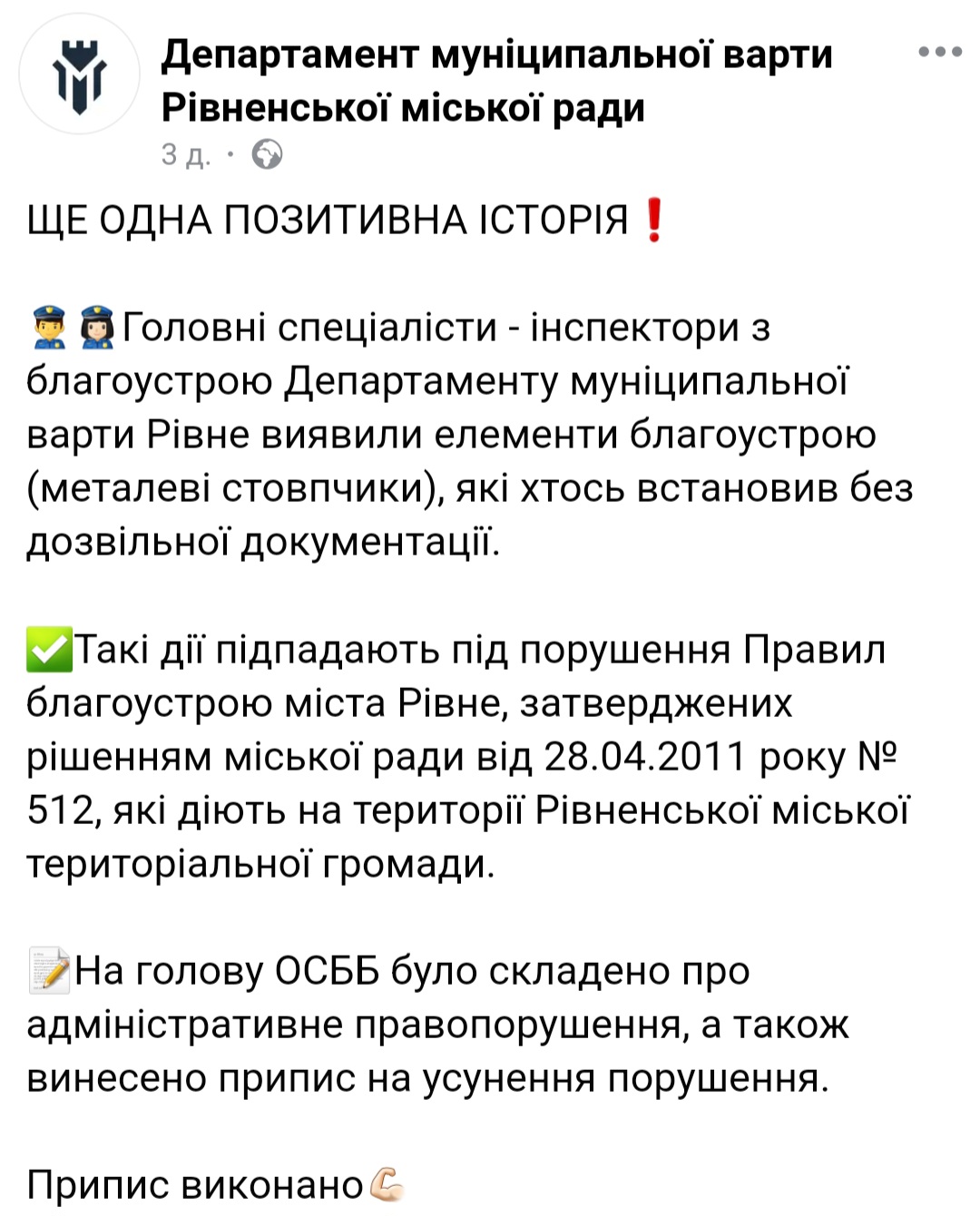 Про це йдеться у дописі Департаменту муніципальної варти Рівного: