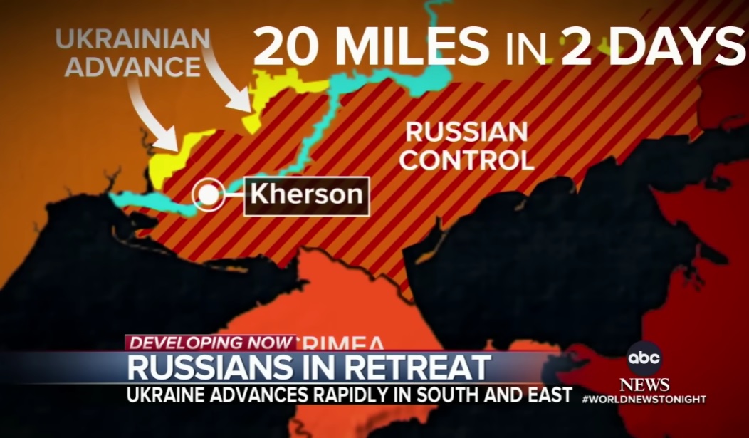Як повідомляє телеканал «ABC», ЗСУ змогли прорвати лінію фронту в багатьох місцях. Якщо Росія тижнями брала штурмом по одному метру української землі, то українські військові просунулися вглиб лінії фронту приблизно на 80 кілометрів.