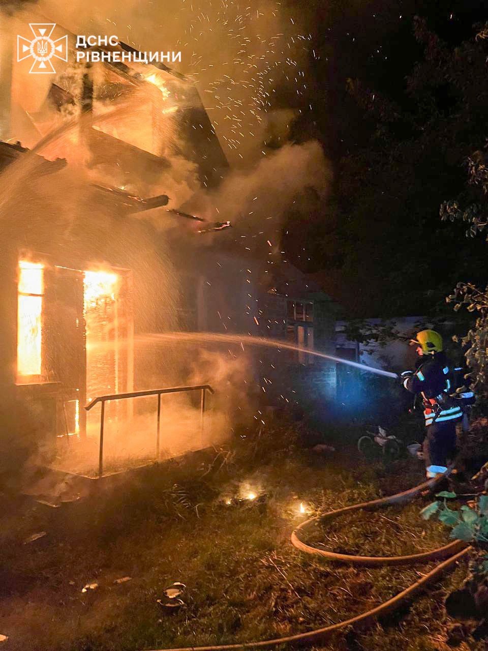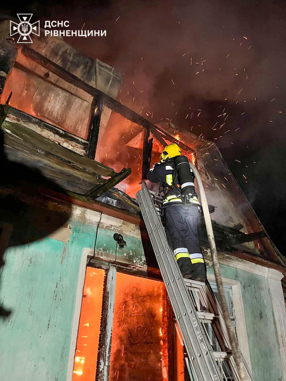 – На виклик прибули рятувальники 24-ї та 6-ї державних пожежно-рятувальних частин. Вогнеборці боролися з полум’ям майже чотири години, існувала загроза поширення вогню на поруч розташовану господарську будівлю. Вогонь знищив покрівлю та перекриття, а також речі домашнього вжитку, – розповіли у ГУ ДСНС Рівненщини.