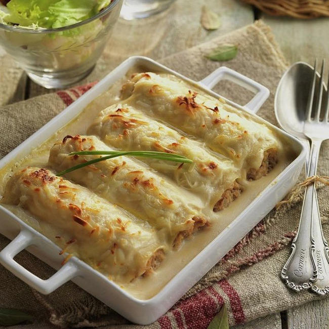 Інгредієнти: курячий або індичий фарш (400 г), сіль, перець, паприка, цибуля (1 шт.), канелоні (11 шт.), вершки (500 мл), сир (150 г).