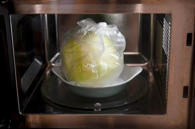 Є альтернатива — використати мікрохвильовку. Спочатку з капусти необхідно вирізати серцевину — цей крок робить листя більш гнучким і дозволяє теплу швидше проникати всередину. Далі капусту кладуть у звичайний поліетиленовий пакет і щільно загортають. У такому вигляді качан ставлять у мікрохвильову піч. Уже за кілька хвилин під дією тепла листя починає відділятися та ставати м’яким, а через 10–15 хвилин капуста готова до використання.