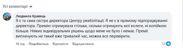 Сестра директорки Лариса Кравець відреагувала на звинувачення. Вона заявила, що не перебуває у прямому підпорядкуванні керівниці та отримувала премії на рівні з іншими працівниками. За її словами, жодних індивідуальних рішень щодо неї не приймали, а всі виплати можна перевірити.