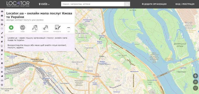 Локатор – це пошуково-картографічний онлайн-сервіс, сучасна варіація довідника. На ньому представлена мапа Києва та України в цілому. За допомогою нього можна знайти підходяще кафе, ресторан, автозаправну станцію, адвокатську контору, салон краси або певну вулицю.