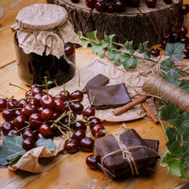 1 кг вишень без кісточок, 1 кг цукру, 100 г какао, 100 г чорного шоколаду