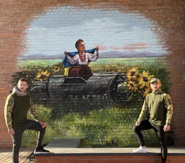 На одній із розбитих стін, посіченій уламками снарядів, художники зобразили дівчину-Україну в обіймах військового. А зверху – голуб миру.