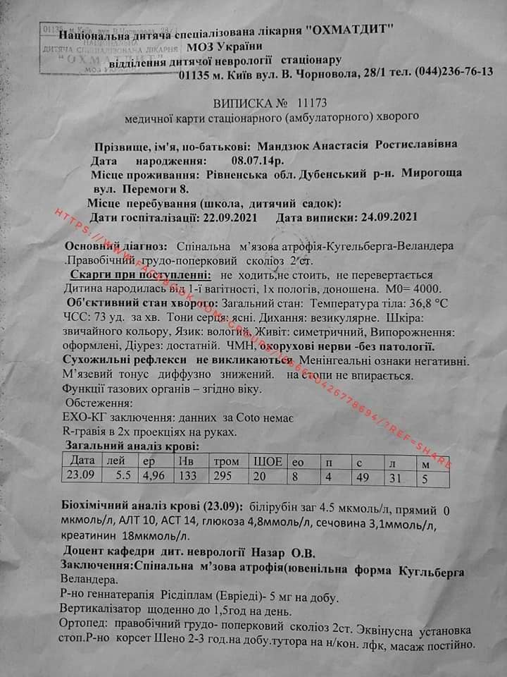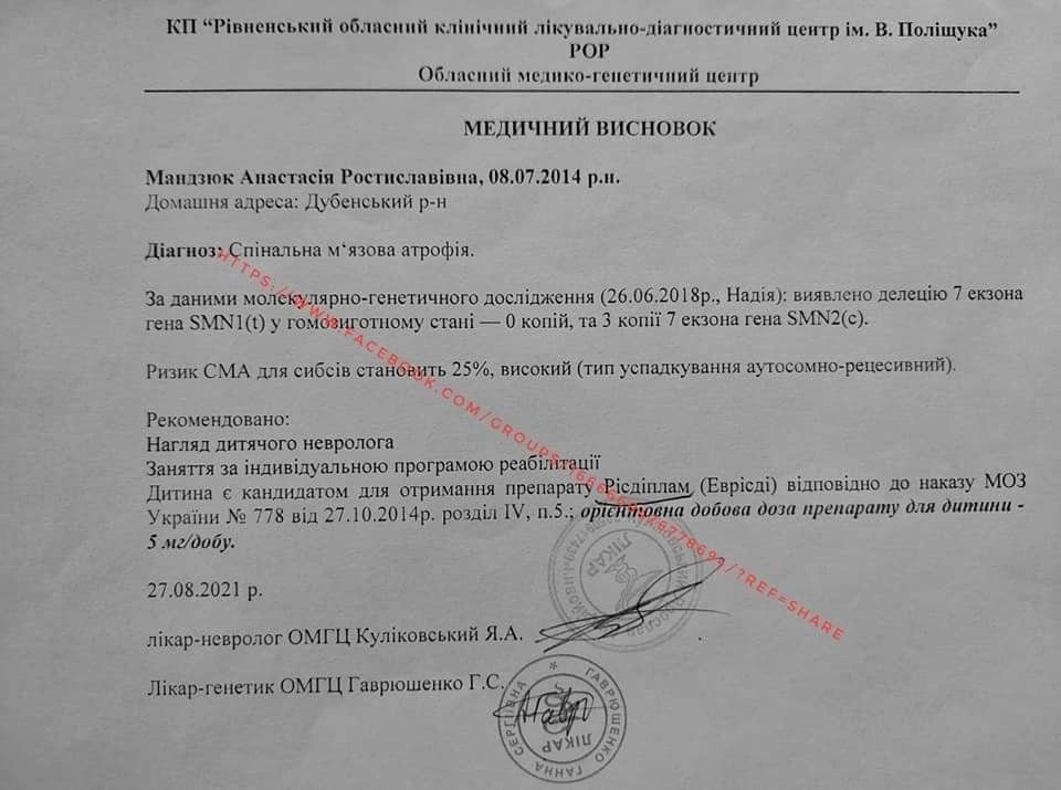 Також жінка додає: «Спінальна м’язова атрофія (скорочено СМА) — рідкісне нервово-м’язове захворювання, що супроводжується втратою мотонейронів та прогресивною атрофією м’язів. У діток та дорослих з такою хворобою атрофуються м’язи і вони перестають ходити, сидіти, а згодом і дихати. Потихеньку жахлива хвороба повільно відбирає навики і у нашої Настуні! А необхідне лікування нашій сім’ї не по кишені».