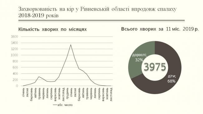 За 11 місяців поточного року в Рівненській області на кір захворіло 3975 осіб, що склало 342,8 вип. на 100 тис. нас. Серед захворілих 2704 дітей (68%). Протягом року було госпіталізовано 1647 хворих, з них 900 дітей. Серед захворілих дітей 32,8% були госпіталізовані, а серед хворих дорослих 57,5% потребували стаціонарної допомоги.