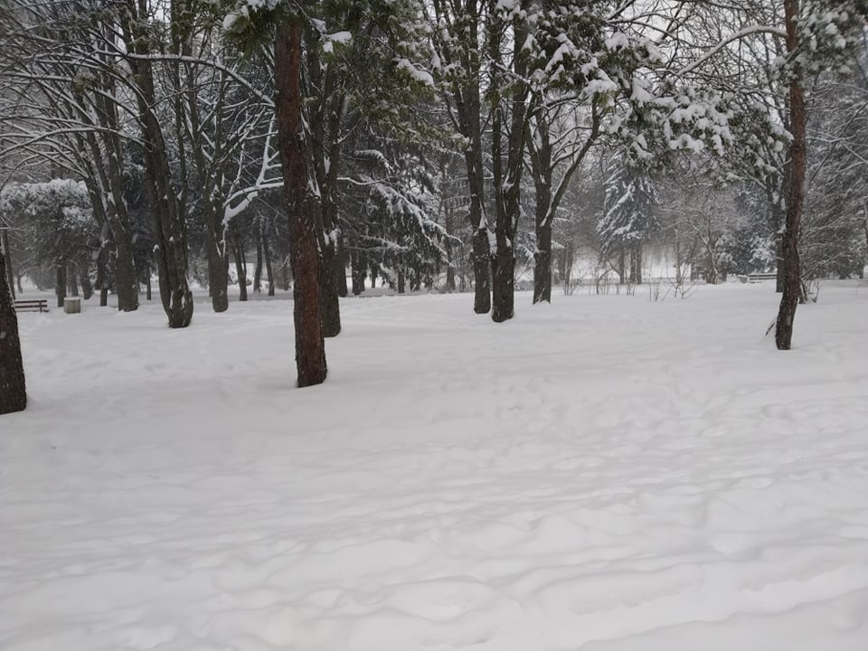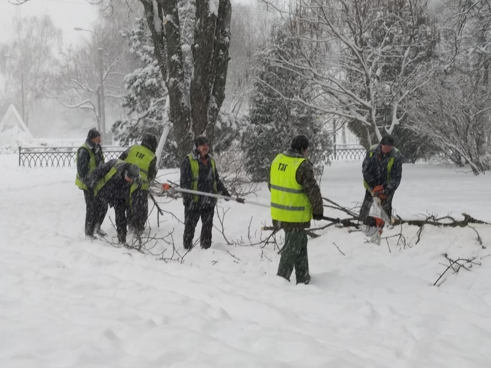 Комунальники ріжуть і забирають гілки дерев, які поламав сніг.