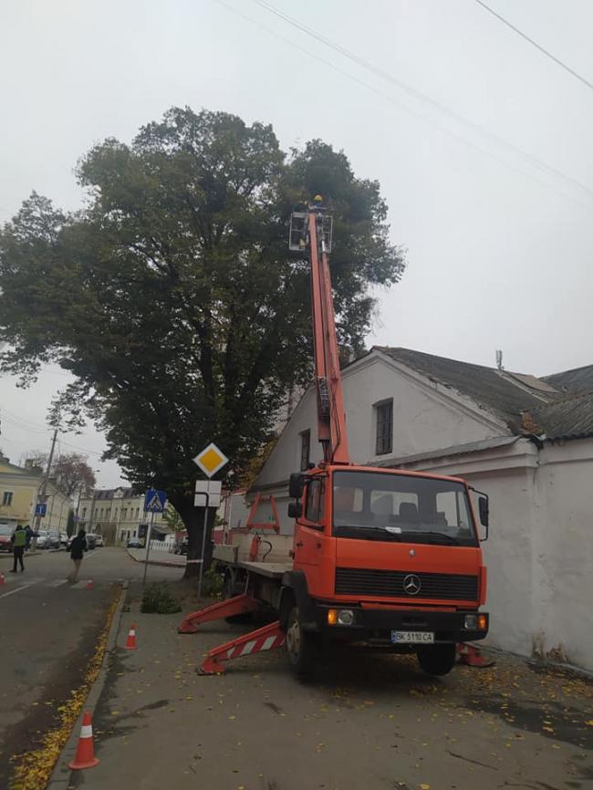 Рівняни опублікували в соцмережі фото столітньої липи на розі вулиць Драгоманова та 16 Липня. Біля неї видно автомобіль з підйомником та працівників, які здійснюють роботи. Місце огороджене.