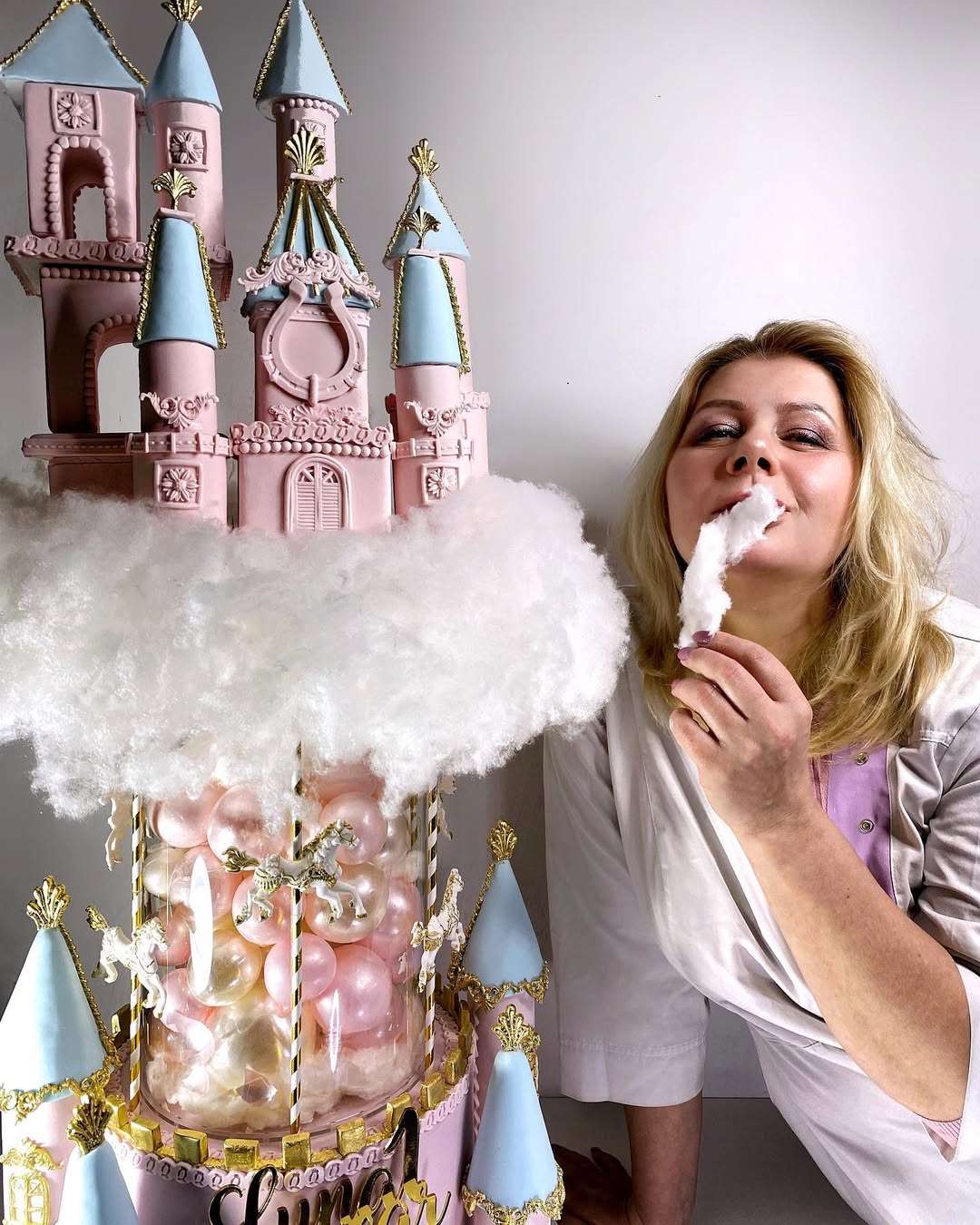 Торт «Замок» з карамельними вежами та хмаркою із цукрової вати. Фото: instagram.com/oksana.shipulina