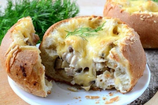 Кілька маленьких булочок (або скибки батона), шампіньйони, твердий сир, майонез