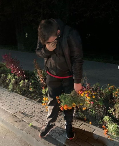 – Знайомтесь, друзі – це Андрій. Прогулюючись об 00:30 по вул. Грушевського, Андрій помітив велику та пишну алею квітів і вирішив вирвати декілька «кущів чорнобривців» прямо з корінням, мовляв – “для мами”. Але, в той час проїжджали місцеві “Садівники”, які побачили цей душевний порив і одразу ж звернулись до Андрійка зі словами: “Зупинись! Не тікай! Ми хочемо тобі допомогти… висадити квіти назад, в клумбу!”.