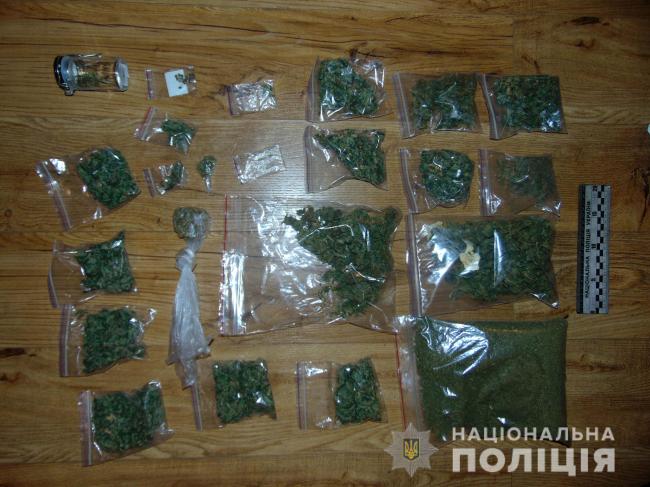 Слідчо-оперативна група в оселі виявила майже кілограм канабісу, з яких 200 грамів — подрібненого та 800 – елітного. Частина наркотиків знаходилася у двох поліетиленових пакетах, а решта — розфасована. Поліцейські виявили пристрій для куріння марихуани з нашаруванням речовини коричневого кольору та залишками речовини зелено-коричневого кольору. У квартирі були поліетиленові пакетики для фасування, чорнові записи, ваги та гроші та валюту на загальну суму понад 25 тисяч гривень.