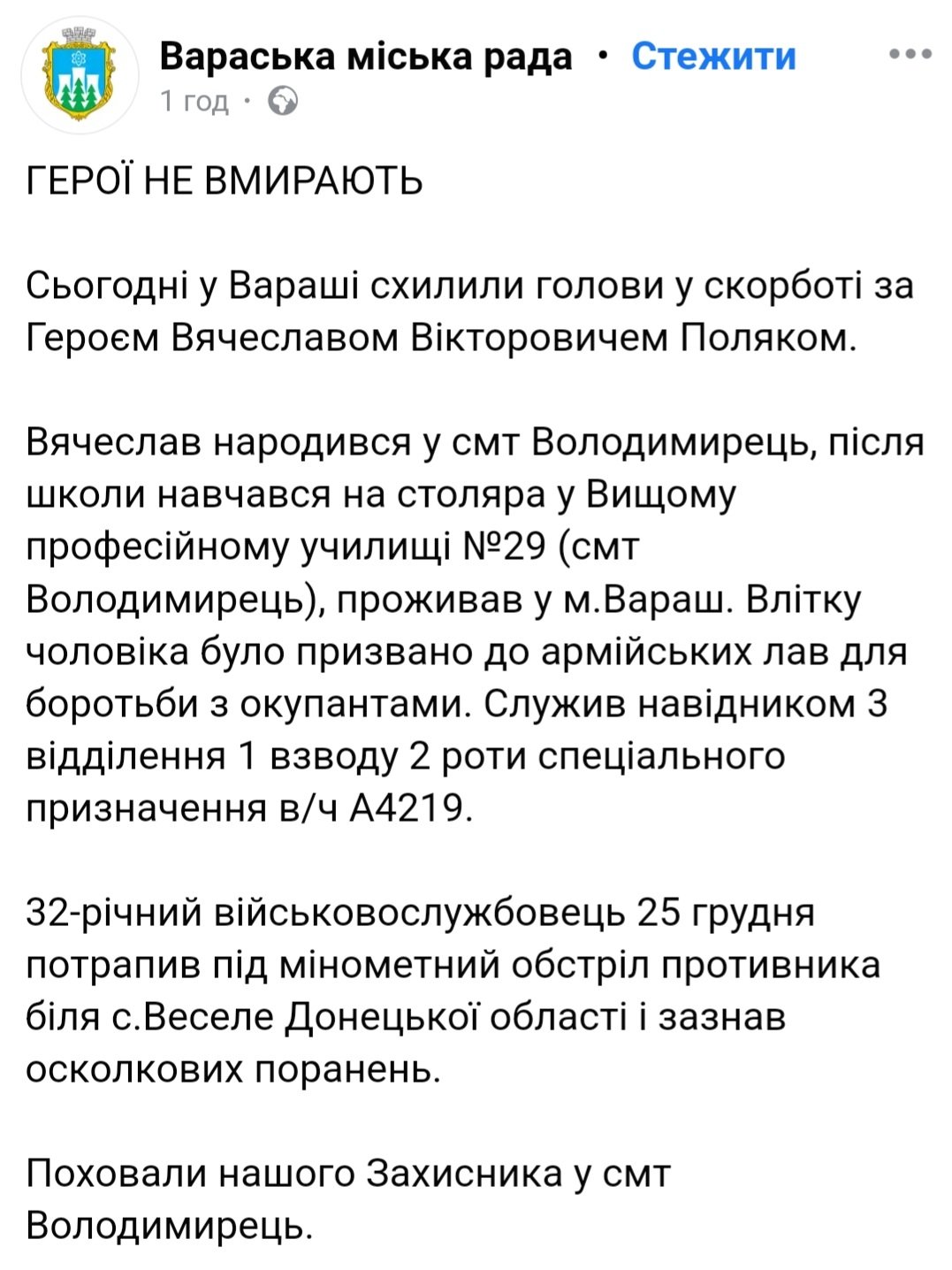 Новини Квіти і сльози: у Вараші на колінах прощалися з 32-річним навідником (ФОТО) В'ячеслав Поляк потрапив під мінометний обстріл ворога на саме Різдво... admin 6 Січня 2024, 21:30 0 хв. читання Поділитися Цієї суботи у місті атомників провели в останню путь хороброго захисника. Лукашенка збили з ніг – під час хокейного матчу «МакДональдс» для водіїв буде у Рівному Підтвердилася загибель п’яти українців у ДТП в Польщі Завтра у Березному навіки проведуть молодшого сержанта На Івано-Франківщині перекинувся пасажирський автобус, є загиблий Поділитися цією статтею Facebook Telegram Копіювати посилання Приєднуйтесь 58KСтежити1.2KСтежити13.9KСтежити6.1KПідписатися Читайте нас у Telegram: тільки важливі та перевірені новини Новини 28 Грудня 2025 Лукашенка збили з ніг – під час хокейного матчу 22:18 «МакДональдс» для водіїв буде у Рівному 21:00 Підтвердилася загибель п’яти українців у ДТП в Польщі 20:43 Завтра у Березному навіки проведуть молодшого сержанта 20:19 На Івано-Франківщині перекинувся пасажирський автобус, є загиблий 19:25 Запечена картопля із соусом карбонара. Рецепт дня 19:09 Мунварта насварила водіїв, які блокують в’їзди та виїзди до ринку Дикого у Рівному 18:50 Ситуація в Гуляйполі справді складна, тривають бої, – Сили оборони півдня України 18:16 Разом з вірною Аідою кінолог з Рівненщини два місяці розміновував Херсонщину 17:32 Оголосили перемир’я з росіянами, але тільки – на Запорізькій АЕС 17:05 Всі новини