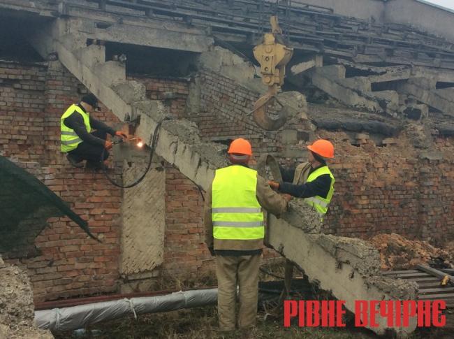 Будівельники за допомогою крана демонтують західну трибуну, яка вважається основною, та зривають стільці. Після цього приберуть і східну трибуну.