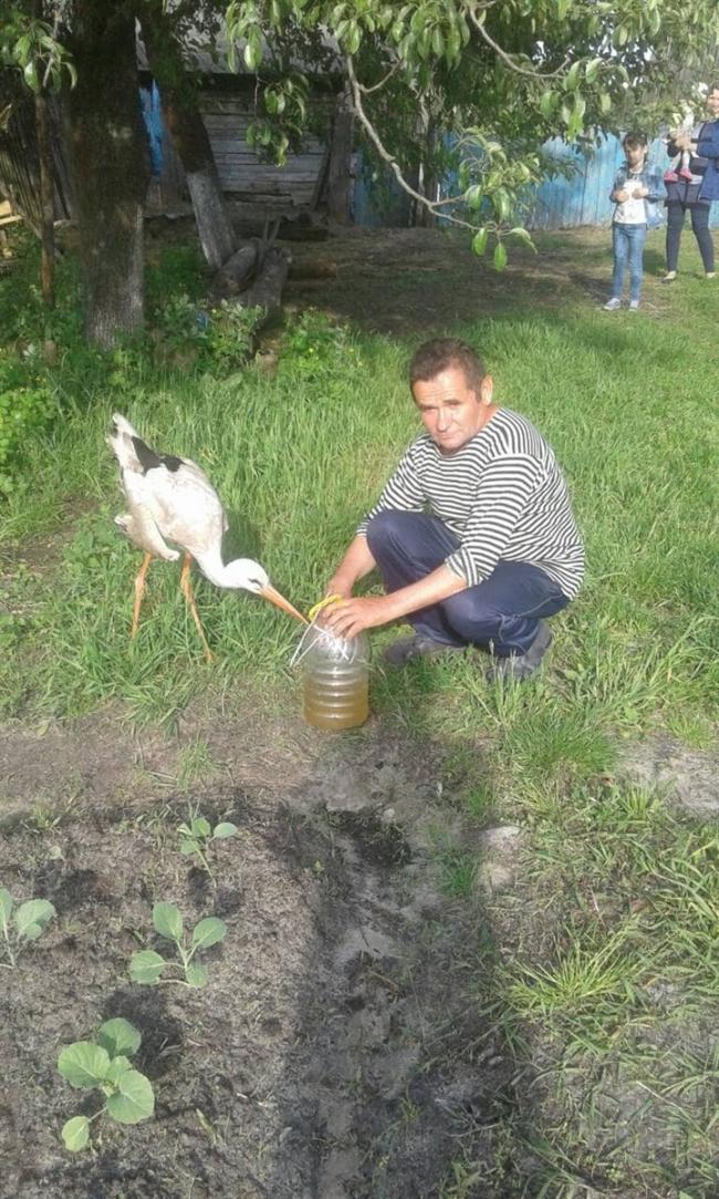 – Хех, кумедія була раз з нашим чудаком. Пішов я з ним на ставок по рибу. Бо ж не накупляєшся кожен раз. Підсобили односельці – спеціально для нашого Лелеки хлопці принесли малька і запустили в ставок, щоб на корм було. Поки суд  да діло, поки я там з сачком возився, він ходив кругом, виглядаючи рибу. Е, кажуть дурна пташка! Добре він знає, що то йому рибу ловлю! Вибрав я рибу, повернувся вкинути в відро, тут чую: хлюп… Обертаюсь, а він в сачку, у воді борсається! Це ж хотів сам рибину зловити – і впав! – розповідає пан Іван.