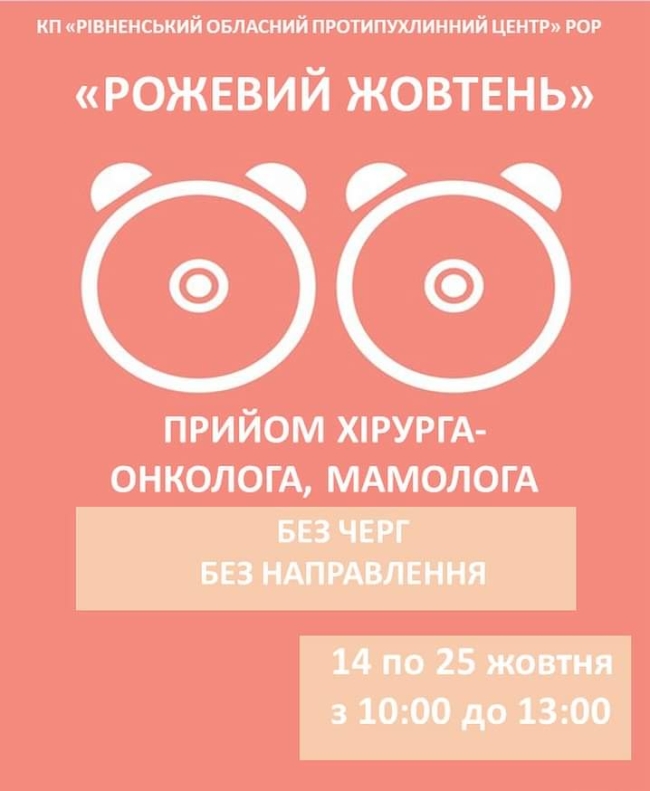 Запрошують усіх жінок з 14 по 25 жовтня пройти безоплатне обстеження у лікарів хірургів-онкологів, мамологів Рівненського протипухлинного центру.