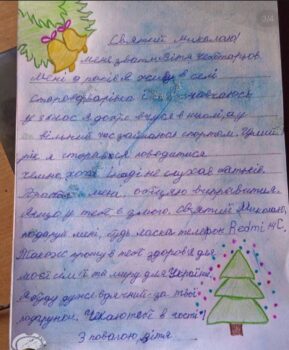 «Святий Миколаю, мене звати Вітя… Цілий рік я старався поводитися чемно, хоча іноді не слухав батьків. Обіцяю виправитись. Подаруй мені, будь ласка, телефон Redmi 14C. Також прошу здоров’я для моєї сім’ї та миру для України».