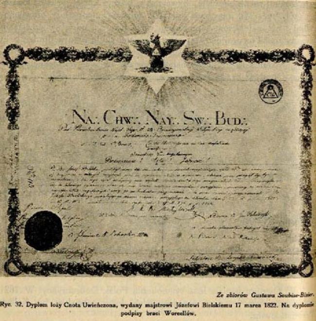 Диплом ложі «Увінчана чеснота», виданий майстрові Йозефові Берському 17 травня 1822 року. На дипломі підписи братів Ворцелів