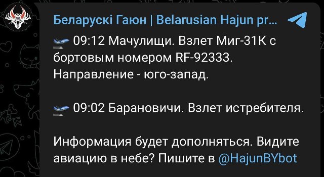 Є зліт МіГ-31 в Білорусі (Мачулищі), який є носієм гіперзвукових ракет «Кинжал».