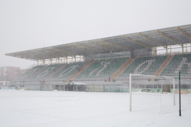 Упродовж дня у Києві сніжило, тому поле стадіону Оболонь Арена вкрите шаром снігу.
