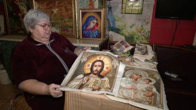 – Як почалась війна і я почала її вишивати. Тривога – невістка та внучка біжать вниз. А баба сидить, вишиває. «Коли ви будете спати?», — запитують. А я кажу: «Вишию ікону, і як вишию, то закінчиться війна». Вони до мене кажуть: «То вишивайте, не спіть»”, — розповідає майстриня.