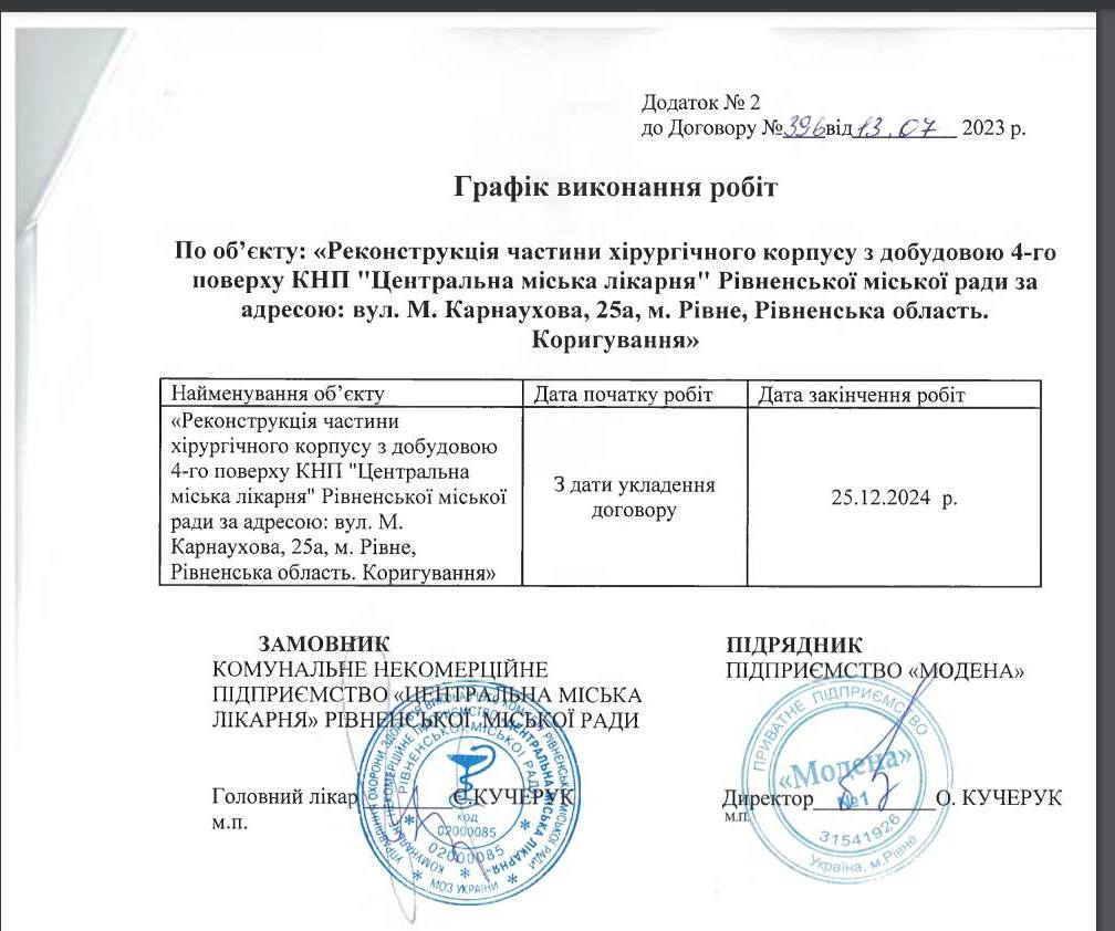 Були укладені договори з цією фірмою і на будівництво нового хірургічного корпусу обласної клінічної лікарні (282 млн.), реконструкцію басейну в Рівному на Коновальця (190.4 млн.), але вони були розірвані.