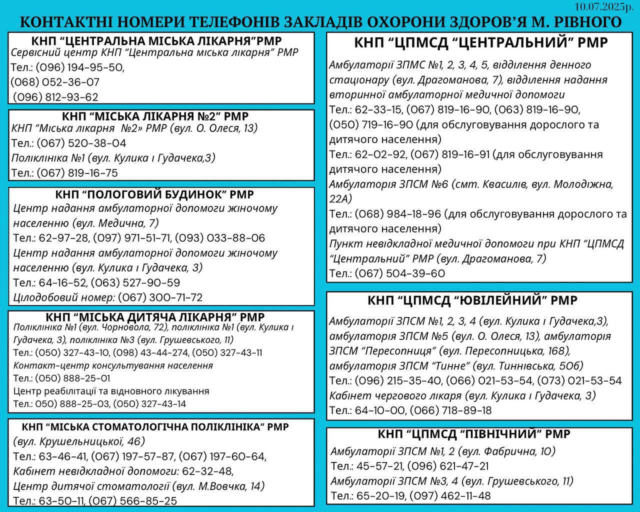 – У частини закладів охорони здоровʼя змінилися контактні номери телефонів! Інформуємо про актуальні номери телефонів реєстратур, – попереджають у міській раді Рівного.